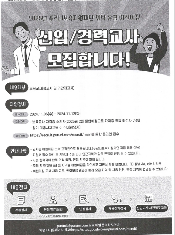 | 제목 | 푸르니보육지원재단 위탁 운영 어린이집 2025년 상반기 정기 신입,경력 교사 채용 | ||||