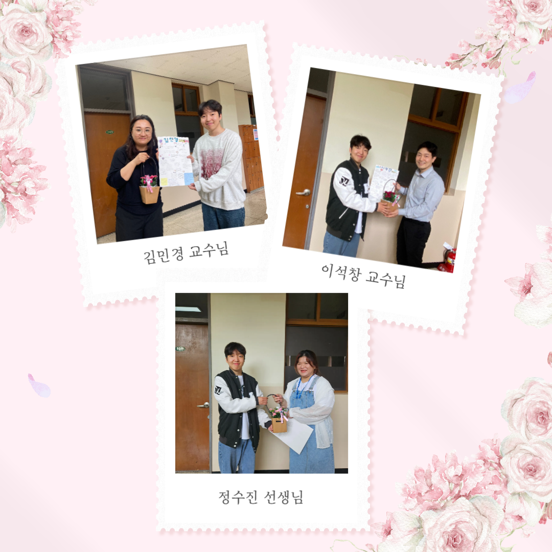 스승의 날을 맞아, 디지털콘텐츠학과에서는 교수님들께 감사의 마음을 전하는 뜻깊은 시간을 가졌습니다. 교수님들께 전달해 드렸습니다.