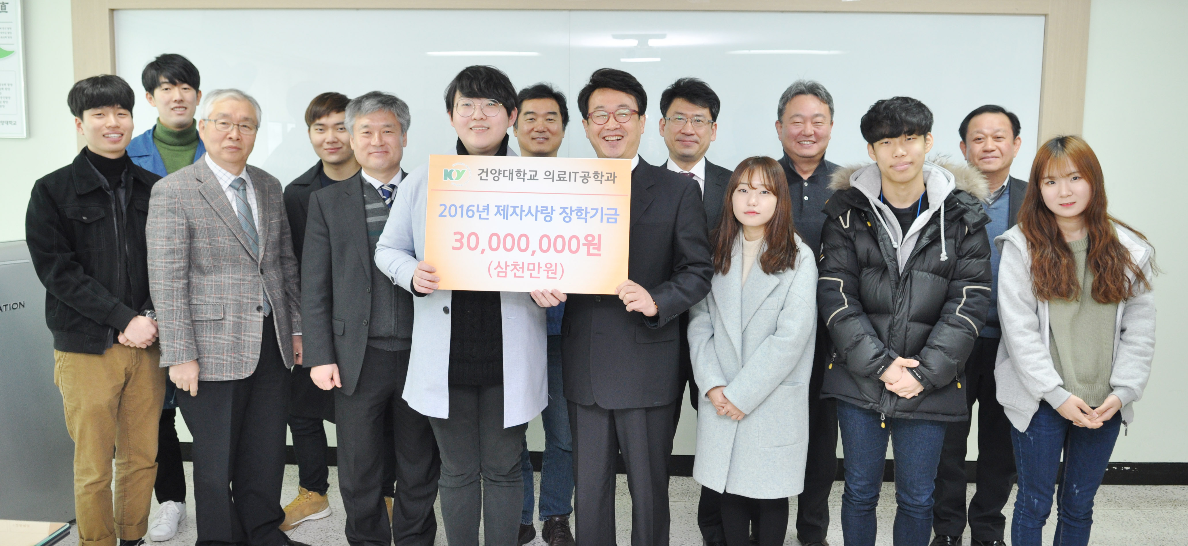 건양대 의료IT공학과 교수들, 제자사랑 장학금 3천만원 조성 가정형편 때문에 진학 또는 학습 포기하는 학생 없도록 교수 11명 뭉쳐 “올해 3천만원 조성, 매년 동일한 수준으로 장학금 만들어 학생들 도울 것” 건양대학교(총장 김희수) 의료IT공학과 교수들이 가정형편이 어려운 제자들을 위해 학과 차원에서 직접 장학금을 조성하기로 해 주변을 훈훈하게 하고 있다. 의료IT공학과(학과장 김용석) 교수 11명은 29일 건양대 창의융합캠퍼스에서 2016년 입학한 신입생 및 재학생들에게 3천만원의 장학금을 전달하는 내용의 약정식을 가졌다. 이 자리에는 올해 입학한 신입생 대표 학생 2명도 참석해 그 의미를 더했다. 김용석 의료IT공학과 학과장은 이번 제자사랑 장학금 조성에 대해 “입시를 앞둔 고등학생들과 상담을 하다보면 우리 학과에 오고 싶어도 어려운 가정형편 때문에 대학입시를 포기하는 학생들이 종종 있다”며 학생들이 등록금 걱정을 덜고 원하는 학과에 올 수 있도록 교수님들이 뜻을 모았다고 배경을 설명했다. 장학금 조성은 학과 교수들이 진행하게 될 외부 연구사업 및 프로젝트를 통해 얻는 인센티브의 상당부분을 내놓고 또한 학과 차원에서 다양한 방식으로 장학금을 모금하기로 했다. 김용석 학과장은 “재학생의 경우도 학습의지가 강한데 집이 어려워 아르바이트를 해야 하거나, 심지어는 최근 지속되는 경기불황으로 중도포기를 생각하는 학생까지 있다”며 “올해 3천만원 장학금 조성을 통해 신입생과 재학생 30여명에게 장학금을 전달해 그 학생들이 조금이라도 더 좋은 환경에서 학업에 집중할 수 있도록 하겠다”고 밝혔다. 의료IT공학과 교수들은 이번 장학금 조성이 일회성에 끝나는 게 아니라 내년부터 지속적으로 올해와 비슷한 수준의 장학금을 조성해 학생들을 도울 예정이다.