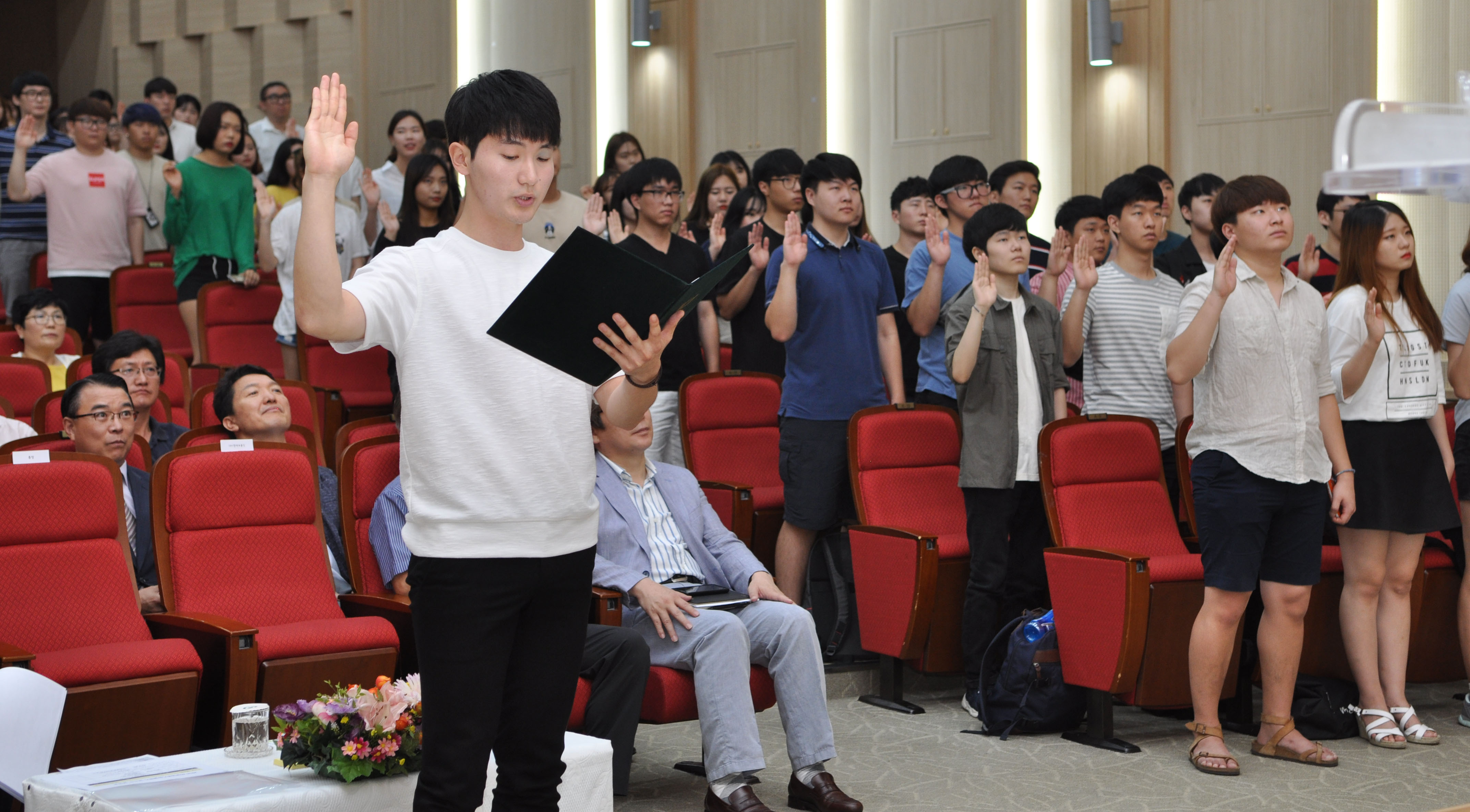 건양대 학생들이 취창업동기유발학기에서 명예코드 선언식을 하고 있다.jpg