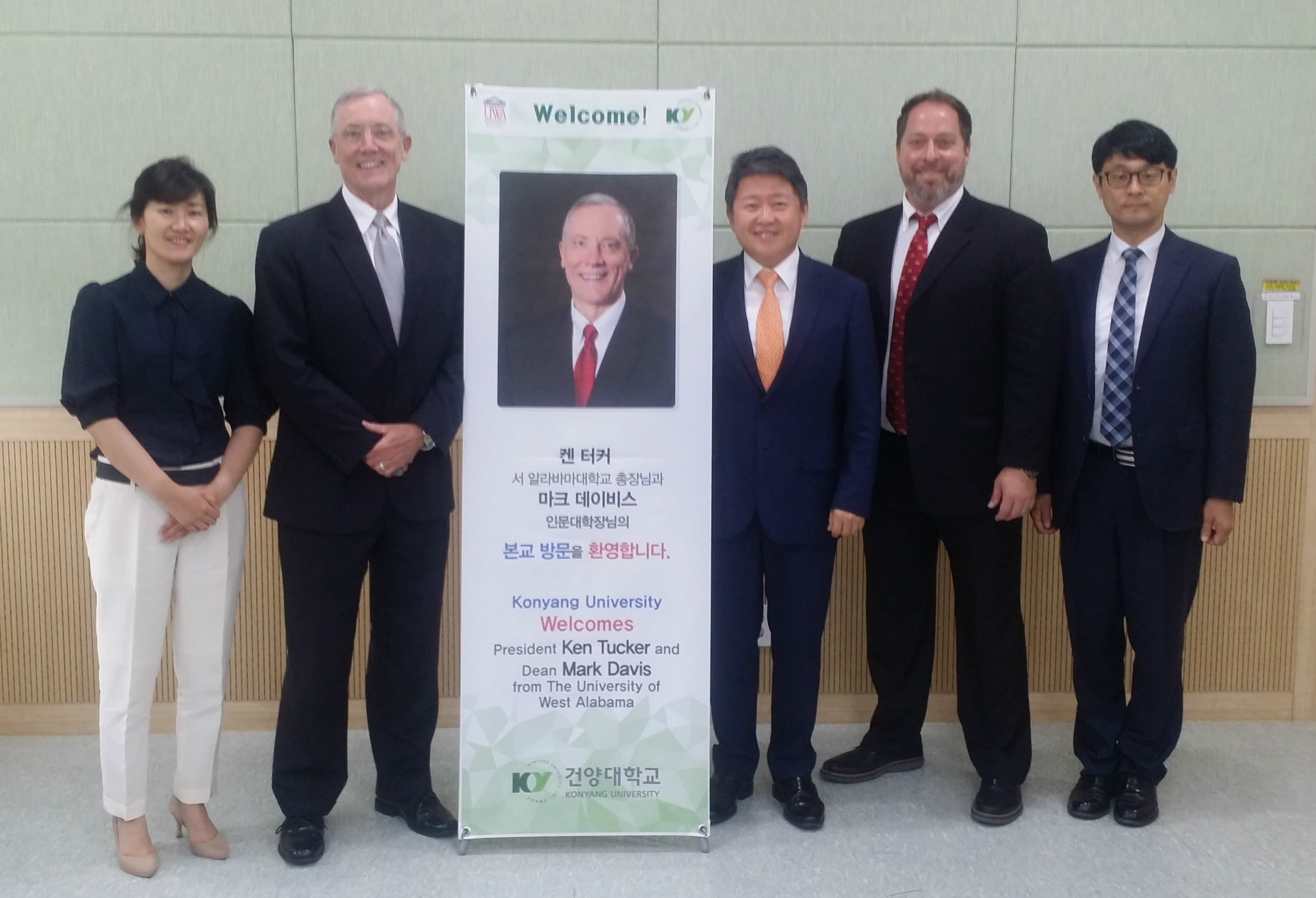 건양대학교(총장 김희수)의 자매대학인 미국 웨스트 알라바마(West Alabama)대학 총장단이 19일 건양대를 방문했다. 웨스트 알라바마대학 켄 터커(Ken Tucker) 총장과 데이비스 마크(Davis Mark) 인문대학장은 이날 오전 건양대 대전 메디컬캠퍼스에서 김희수 총장, 김용하 부총장, 정헌식 국제교육원장, 우수정 교수 등과 만나 상호교류 및 복수학위 협약에 따른 교환학생 프로그램 추진 프로그램을 협의했다. 건양대와 웨스트 알라바마 대학은 지난해 5월 건양대에서 1학년을 마친 학생이 웨스트 알라바마 대학교에서 남은 학기를 등록해 공부하고, 양 대학이 요구하는 졸업요건을 충족한 경우 복수 학위를 수여하는 1+3 복수학위 프로그램에 대해 상호협약을 체결했다. 또한 건양대생이 교내 영어 프로그램 이수 및 영어능력시험을 통과한 경우에 웨스트 알라바마 대학교의 입학요건인 OEFL·IELTS를 면제받는 내용도 협약에 포함됐다. [사진설명] 미국 웨스트 알라바마대학 총장단이 19일 건양대를 방문했다. 사진은 왼쪽부터 건양대 우수정 교수, 웨스트 알라바마대학 켄 터커 총장, 건양대 김용하 부총장, 웨스트 알라바마대학 데이비스 마크 인문대학장, 건양대 정헌식 국제교육원장 순.