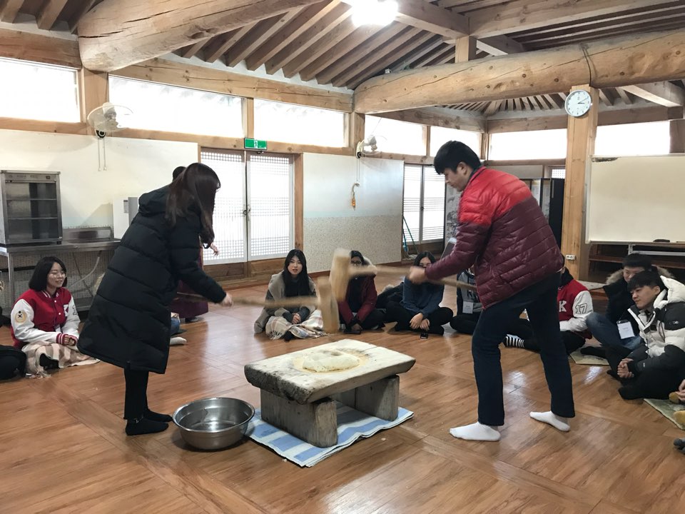 유학생들이 직접 떡을 치며 인절미를 만드는 모습.jpg