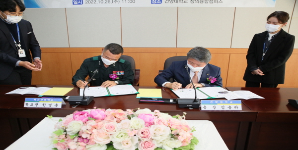 건양대학교(총장 김용하)와 육군 보병학교(학교장 한영훈)가 26일 오전 건양대 창의융합캠퍼스 명곡정보관에서 군산학 연구 및 기술개발 및 우수인재 양성을 위한 상호협력 등을 골자로 하는 교류⸱협력 협약을 체결했다.