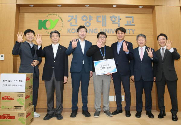 건양대는 정용현 주임을 축하하며 출산축하금 100만원과 산모를 위한 건양대병원 건강검진권 그리고 기저귀를 선물했다.