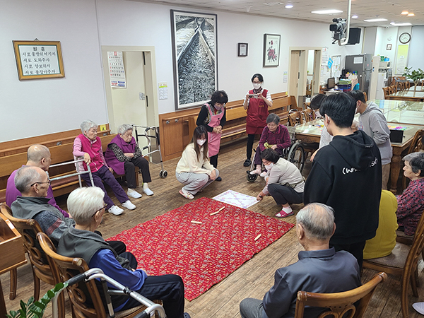 8일 지역 성애노인요양원을 방문해 어르신들과 윷놀이를 하고 있는 건양대 간호학과 학생들.jpg