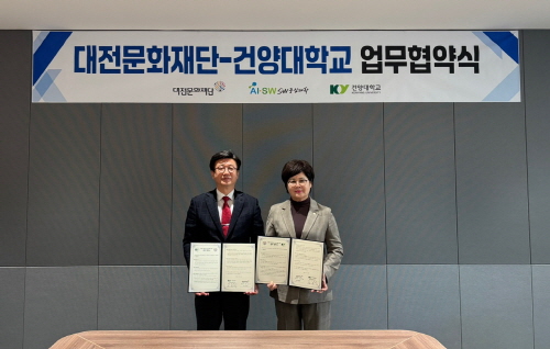 건양대학교(총장 김용하) SW중심대학(단장 김용석)과 대전문화재단(대표이사 백춘희)이 21일 건양대 대전 메디컬캠퍼스에서 SW중심대학 사업의 성공적 추진 및 활성화를 위해 대전지역 예술인의 AI·SW 활용 역량을 강화하고 예술과 기술의 융합을 촉진하는 내용의 업무협약을 체결했다.