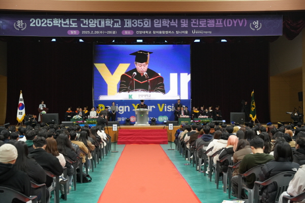 건양대, 26일 2025학년도 입학식 및 진로캠프 개최 98세 김희수 명예총장 신입생 위한 색소폰 공연 건양대학교(총장 김용하)가 26일 논산 창의융합캠퍼스 짐나지움에서 2025학년도 신입생에 대한 제35회 입학식 및 진로캠프 DYV(Design Your Vision) 입소식을 개최했다. 이날 입학식 및 진로캠프 입소식에는 건양대 2025학년도 신입생과 학부모, 건양대 김희수 설립자 겸 명예총장, 학교법인 건양교육재단 김천중 이사장, 건양대 김용하 총장, 논산시 백성현 시장, 건양사이버대 이동진 총장, 건양교육재단 김규일 법인총괄본부장, 건양중고등학교 조익수 교장을 포함해 건양대 주요 보직교수 및 학과장, 재학생, 교직원들이 참석했다. 입학식은 김용하 총장의 입학허가 선언을 시작으로 신입생 대표 학생의 신입생 선서, 성적우수자에 대한 장학증서 수여, 총장 입학식사, 이사장/논산시장 축사가 이어졌고 건양대 설립자인 김희수 명예총장이 색소폰을 연주하는 특별공연도 진행됐다. 김용하 건양대 총장은 축사를 통해 “오늘 이 자리에 온 신입생 여러분들이 4년 뒤에 어떻게 변화했을지 기대하며 마음이 설렌다”며 “오늘 이 자리에 오신 신입생 여러분들 모두가 건양이라는 또 다른 이름을 갖게 됐다. 이 이름의 명예를 서로 높여주는 여러분이 되기를 바란다”고 밝혔다. 이날 입학식에 이어 진행된 진로캠프 DYV 입소식을 통해 신입생들은 이날을 시작으로 2박3일간 ▲대학생활 네트워크 만들기 ▲나를 브랜딩하다 ▲진로로드맵 작성 ▲진로토크콘서트 ▲연예인 공연 등 대학생활에 필요한 정보를 얻고 본인의 진로를 결정하는 한편 학우들과 친해질 수 있는 다양한 프로그램을 진행하게 된다.