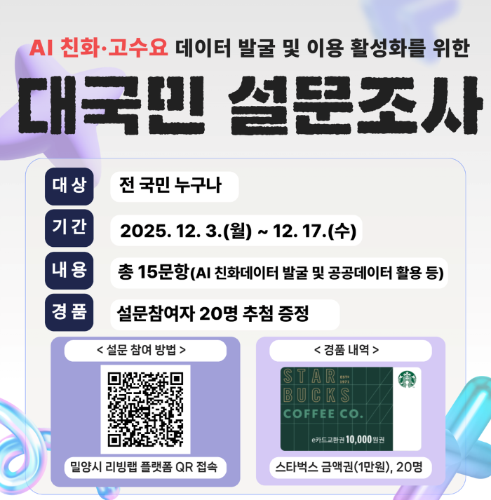 ○ 설 문 명 : 대국민 공공데이터 설문조사 ○ 설문기간 : 2025. 12. 3.(수) ~ 12. 17.(수) ○ 설문대상 : 전 국민 ○ 설문내용 : 총 15문항(AI 친화데이터 발굴 및 공공데이터 활용 등) ○ 참여방법 : 밀양시 리빙랩플랫폼(https://www.miryang.go.kr/livingLab) > 정책소개 > 정책투표 ○ 설문조사 참여자 대상 이벤트 실시 - 당첨발표: 2025. 12. 18.(목) - 선정방식: 무작위 추첨 - 경품내용: 스타벅스 금액권(1만원 상당, 20명)