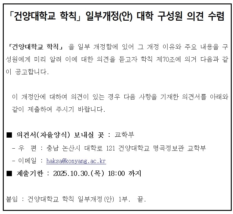 | 제목 | 「건양대학교 학칙」 개정(안) 대학 구성원 의견수렴 | ||||