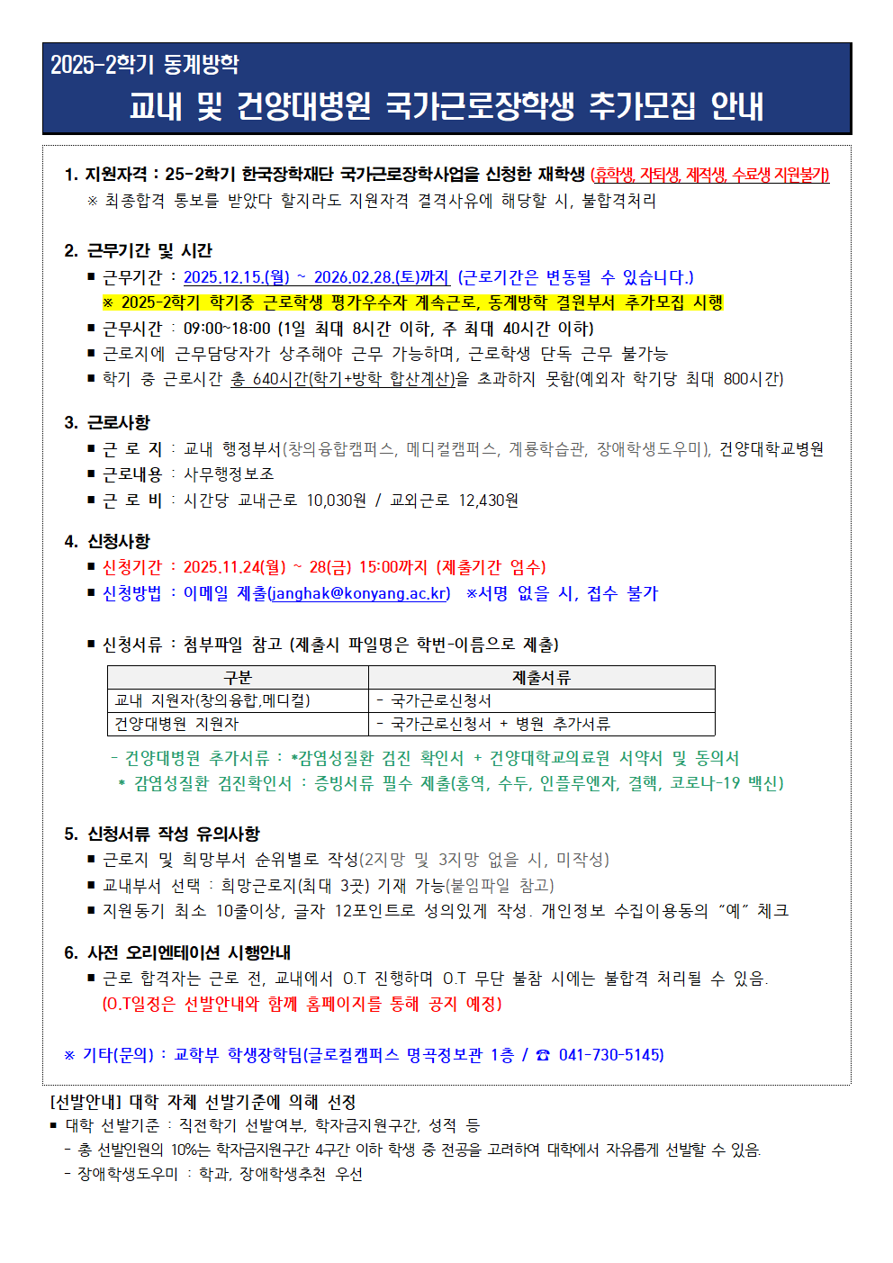 | 제목 | 2025-2학기 동계방학 교내 및 건양대병원 국가근로장학생 추가모집 안내 | ||||