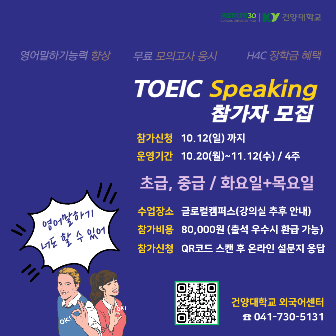 | 제목 | TOEIC Speaking 프로그램 참가자 모집(10.20(월) 시작, 10.12(일) 까지 모집) | ||||