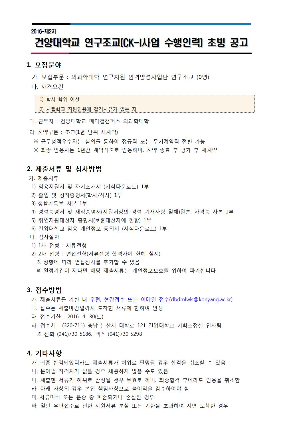 | 제목 | [2016-제2차 공고] 건양대학교 연구조교(CK-I 사업 수행인력) 초빙 공고 | ||||