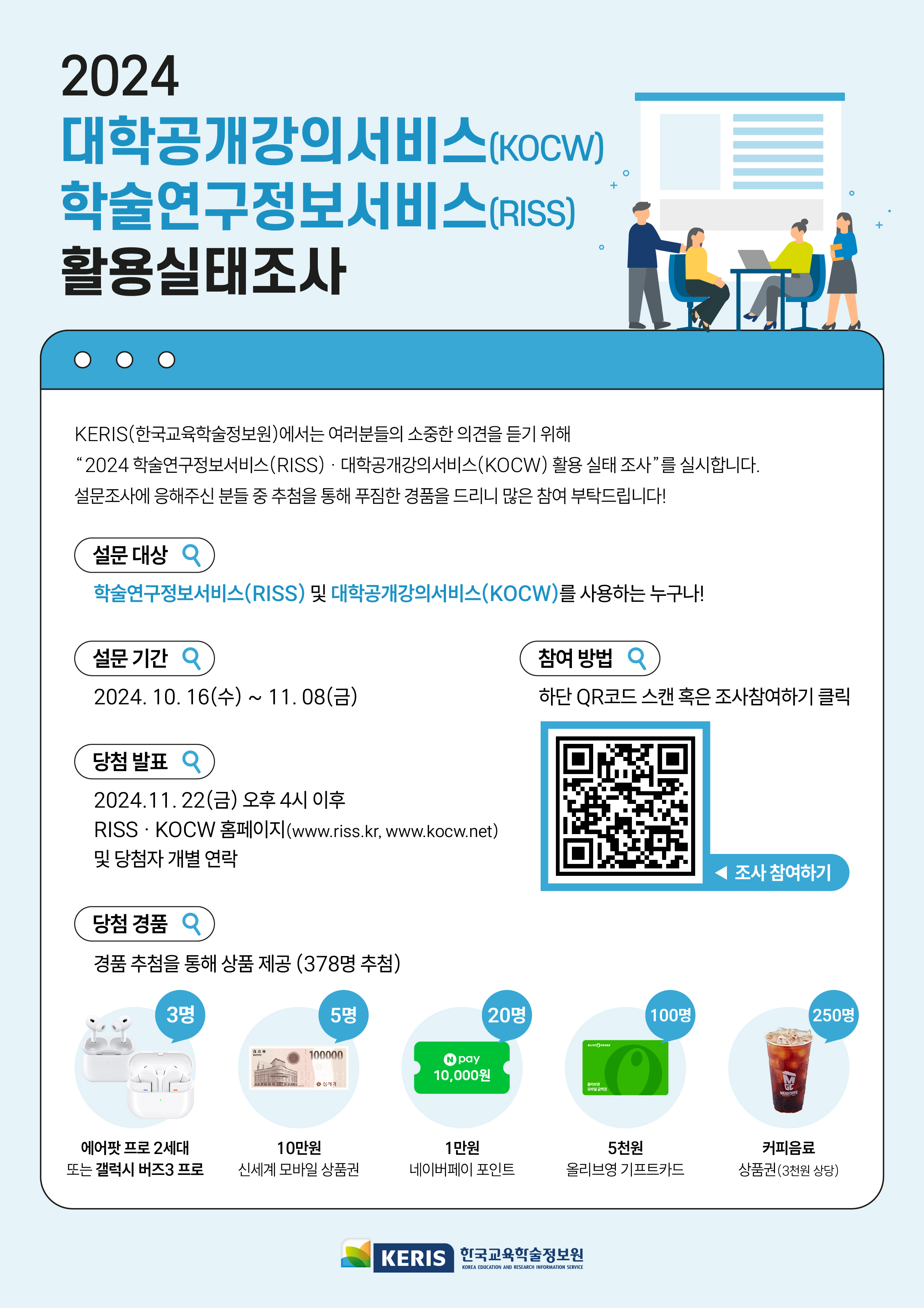 1. 설문대상: 대학공개강의서비스(KOCW)·학술연구정보서비스(RISS)를 사용하는 누구나 2. 설문기간: 2024. 10. 16.(수)~11. 08.(금) - 참여 URL: https://kri.surveybox.kr/?pid=S17975f5ym0k&grpid=rdn&nd= 3. 당첨발표: 2024. 11. 22(금) 오후 4시 이후 KOCW·RISS 홈페이지 및 당첨자 개별 연락 4. 당첨경품: 추첨을 통해 상품 제공(378명) - 에어팟 프로 2세대 또는 갤럭시 버즈3 프로, 신세계 모바일 상품권, 네이버페이 포인트, 올리브영 기프트카드, 커피음료 상품권