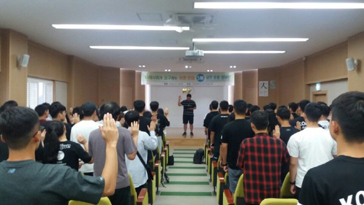 건양대(총장 이원묵) 군사경찰대학은 30일 오후 논산 메디컬캠퍼스 충무홀에서 군사경찰대학 재학생과 교직원 등 300여명이 모인 가운데 無음주, 無흡연, 無시험부정, 無폭력, 無갑질을 다짐하는 '5無 실천운동' 캠페인 발대식을 열었다. 이번 5無 실천운동은 최근 사회적으로 도덕적 기준이 높아지고 각종 부정비리 사건이 만연한 가운데 장차 국가의 공직을 맡게 될 군사경찰대학 학생들이 먼저 솔선수범해 깨끗한 사회를 조성하고자 하는 배경에서 시작됐다. 이세영 군사경찰대학 학장은 "5無 실천은 말보다는 행동이 중요하기 때문에 실천에 옮길 수 있는 다양한 프로그램 개발과 동참분위기를 만들어 나가겠다"고 밝혔다. 건양대 군사경찰대학은 전국에서 유일하게 군사, 경찰, 행정 분야를 융합한 단과대학으로 사회가 요구하는 바른 공공인재 양성을 위한 다양한 교육과 프로그램을 운영하고 있다.