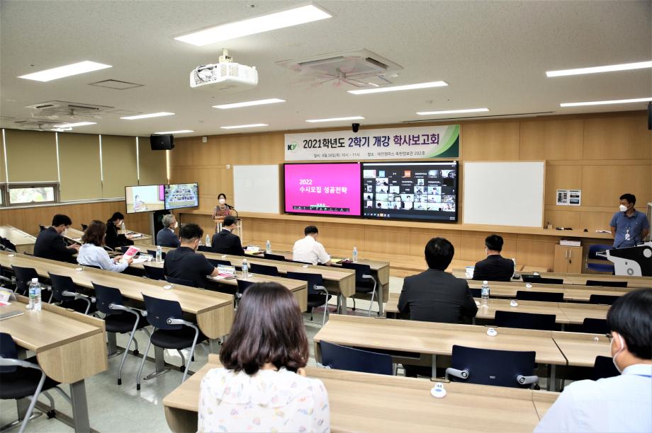 교육성과보고회는 △2022학년 주요 입시계획 △우리대학 핵심아젠다 ESG 교육 가치실현 △직원인사제도 개선 TF팀 운영결과 공유 등을 브리핑하며 대학의 당면한 과제 및 조직 경쟁력 강화를 위한 과감한 제도 혁신을 예고했다. 26일 대전 캠퍼스 및 줌을 통해 진행된 교원 대상 학사보고회에서는 △2022 수시모집 성공전략 △ 사회적 거리두기에 따른 2학기 학사 운영 안내 △대학 코로나19 대응체계 등에 관한 사항을 브리핑하며 포스트 코로나 시대에 대학이 나가야 할 비전과 새로운 가치에 대해 설명하는 시간을 가졌다.