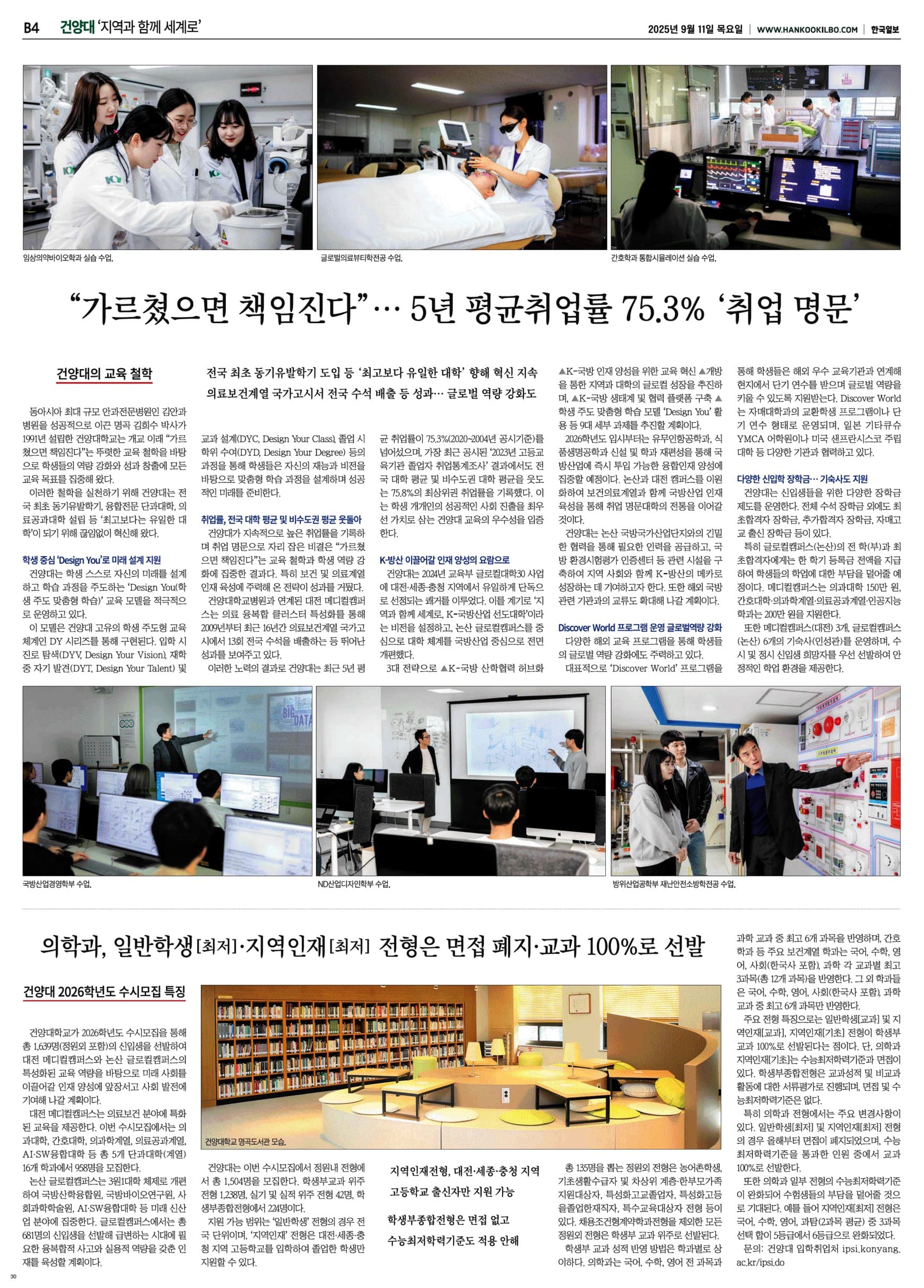 | 제목 | 건양대, “가르쳤으면 책임진다”… 5년 평균취업률 75.3% ‘취업 명문’(2025.09.11.) | ||||