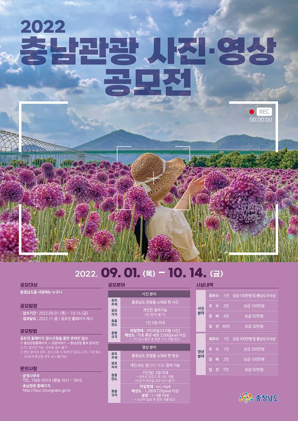 <2022 충남관광 사진•영상 공모전> 주최 • 주관 – 충청남도청 응모분야 - 사진UCC/영상 접수방법 - 홈페이지 시상종류 - 현상공모 접수기간 - 2022-09-01 ~ 2022-10-14 https://www.thinkcontest.com/Contest/ContestDetail.html?id=50091