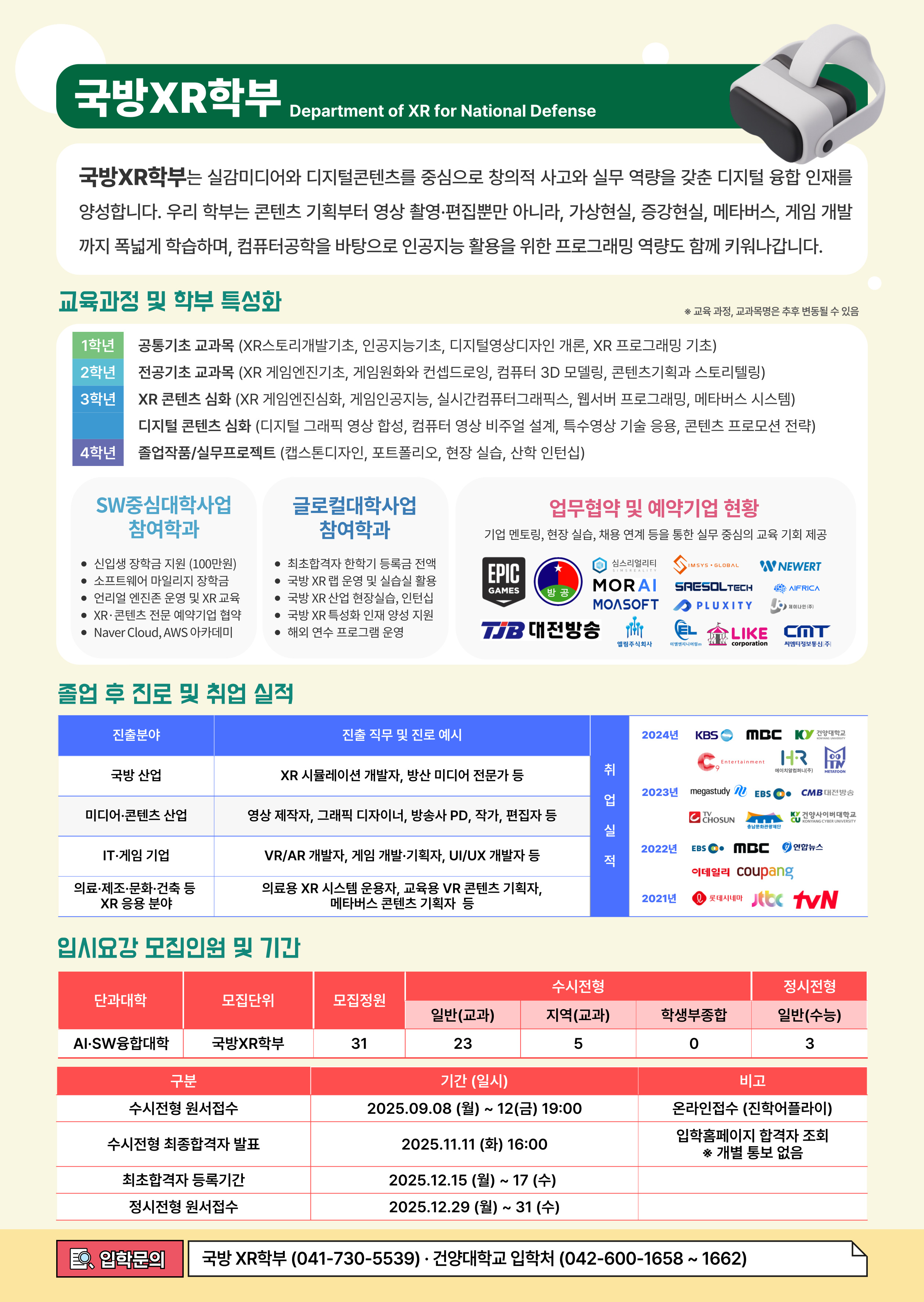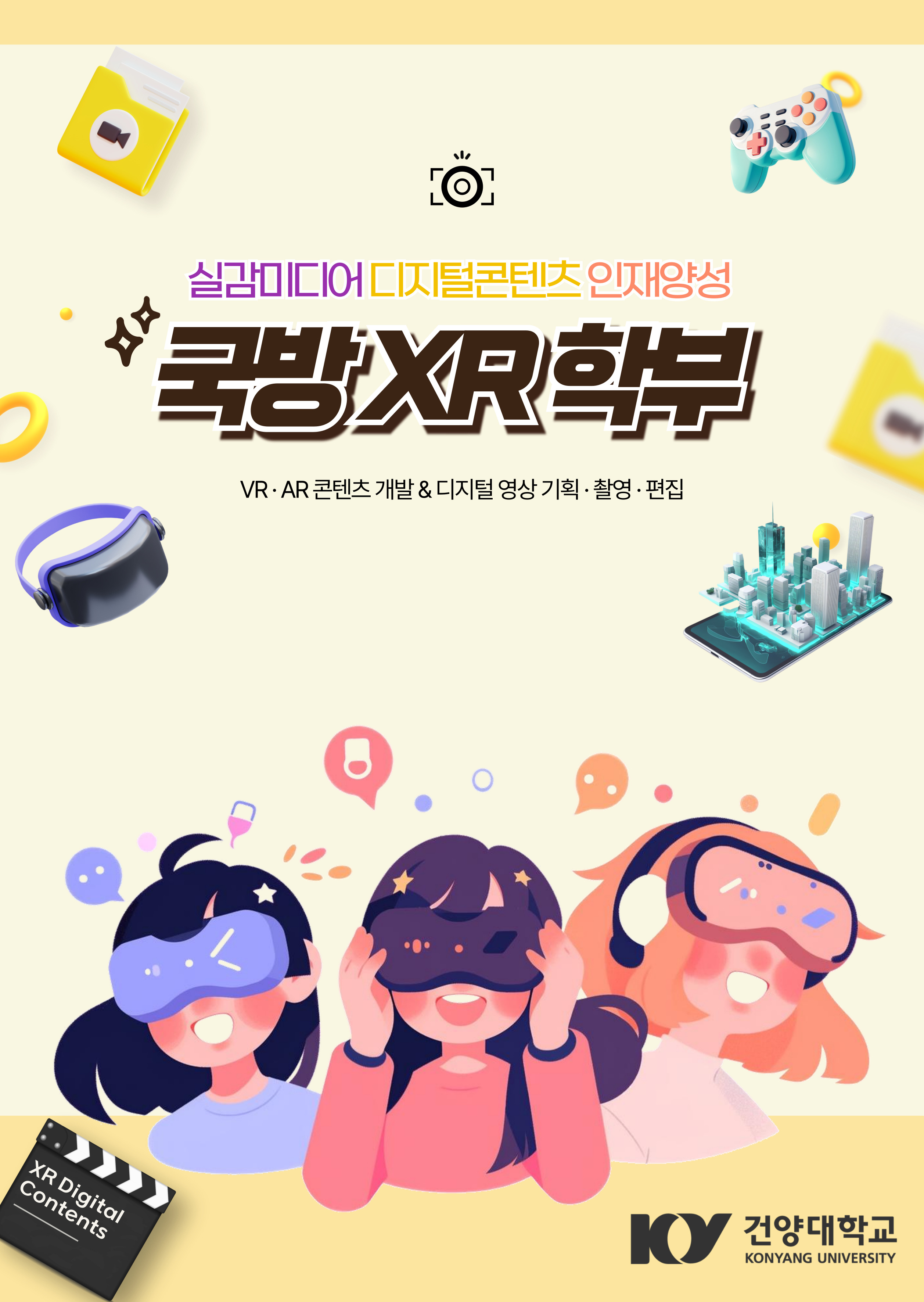 『 실감미디어 디지털콘텐츠 인재양성 국방XR학부 』글의 상세내용을 확인하는 표로 제목, 부서명, 등록일, 조회, 첨부, 내용으로 나뉘어 설명합니다.
