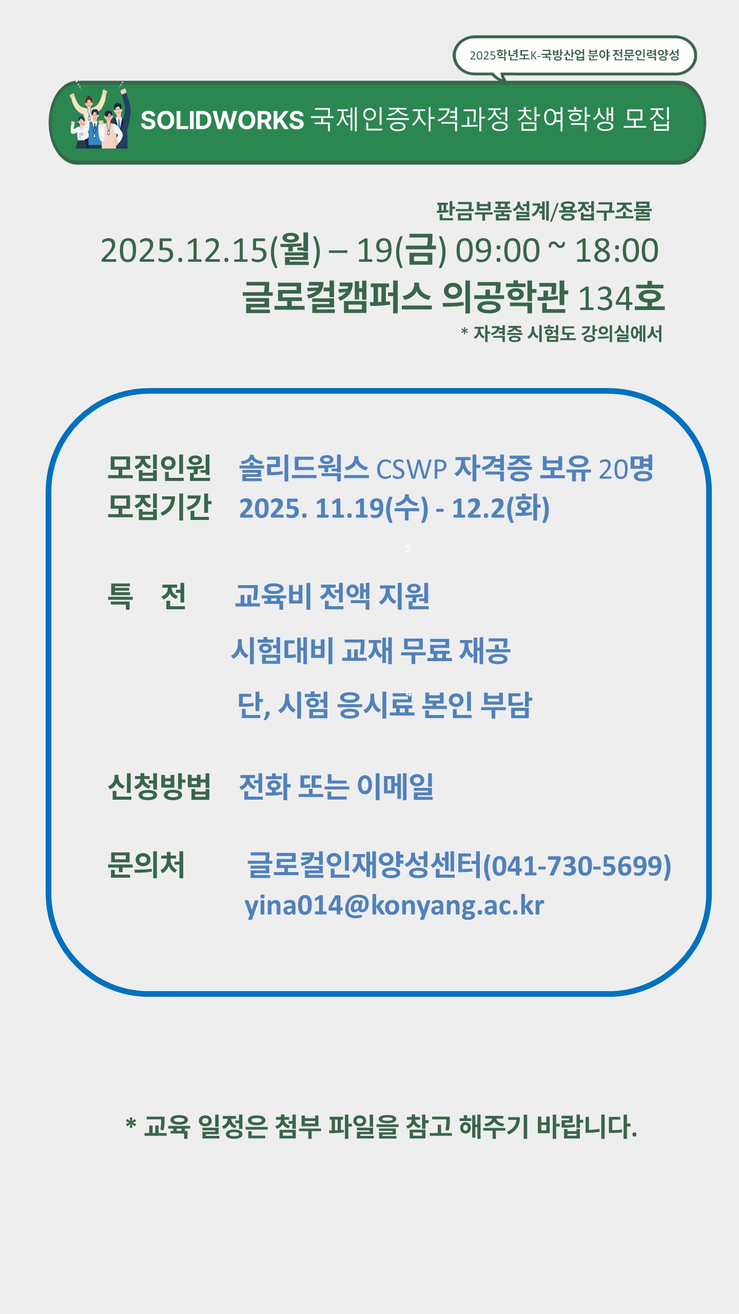 | 제목 | 2025 솔리드웍스 국제자격인증 프로그램 참여학생 모집 공고 | ||||