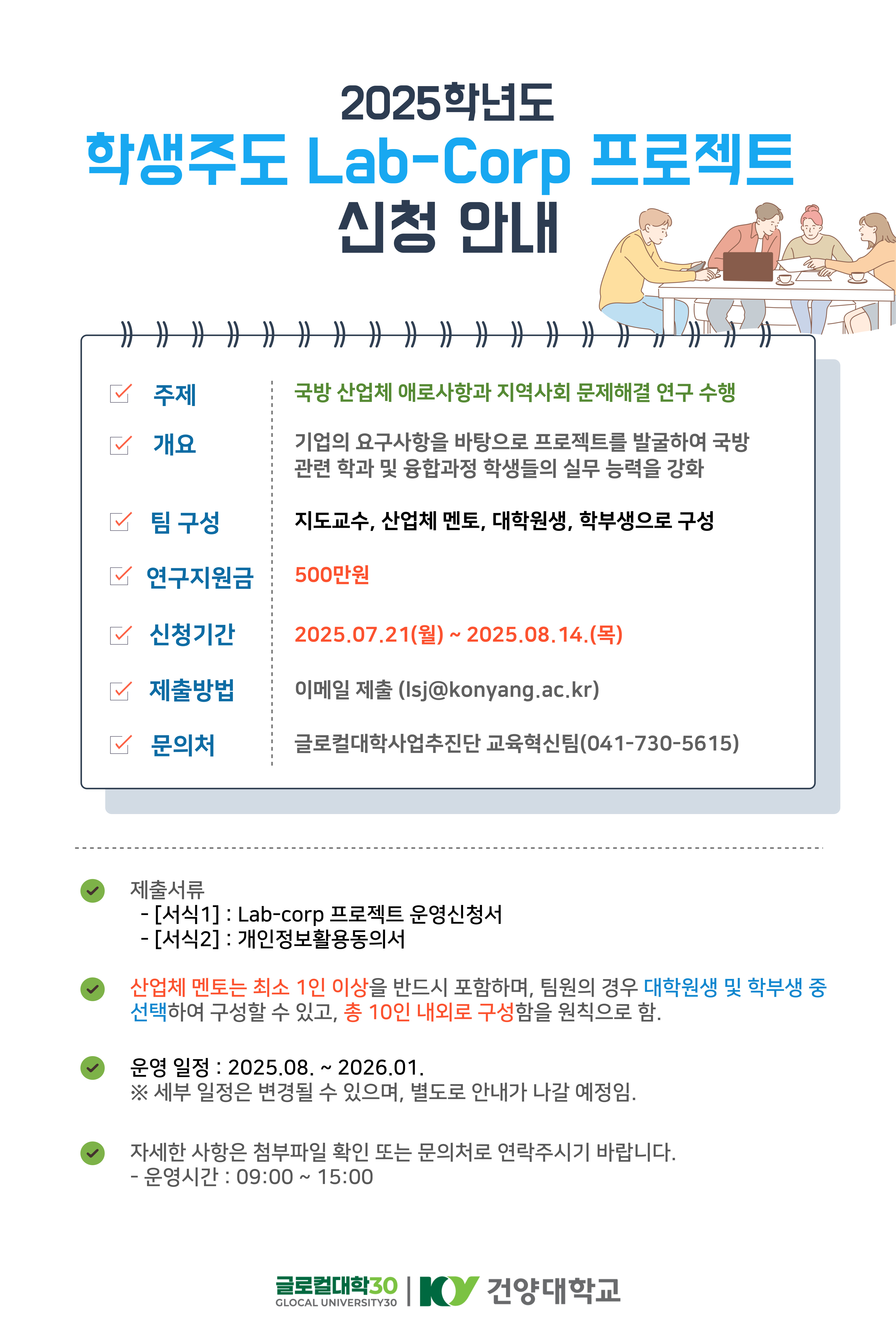 | 제목 | [글로컬대학사업] 2025학년도 학생주도 Lab-corp 프로젝트 모집 안내 | ||||